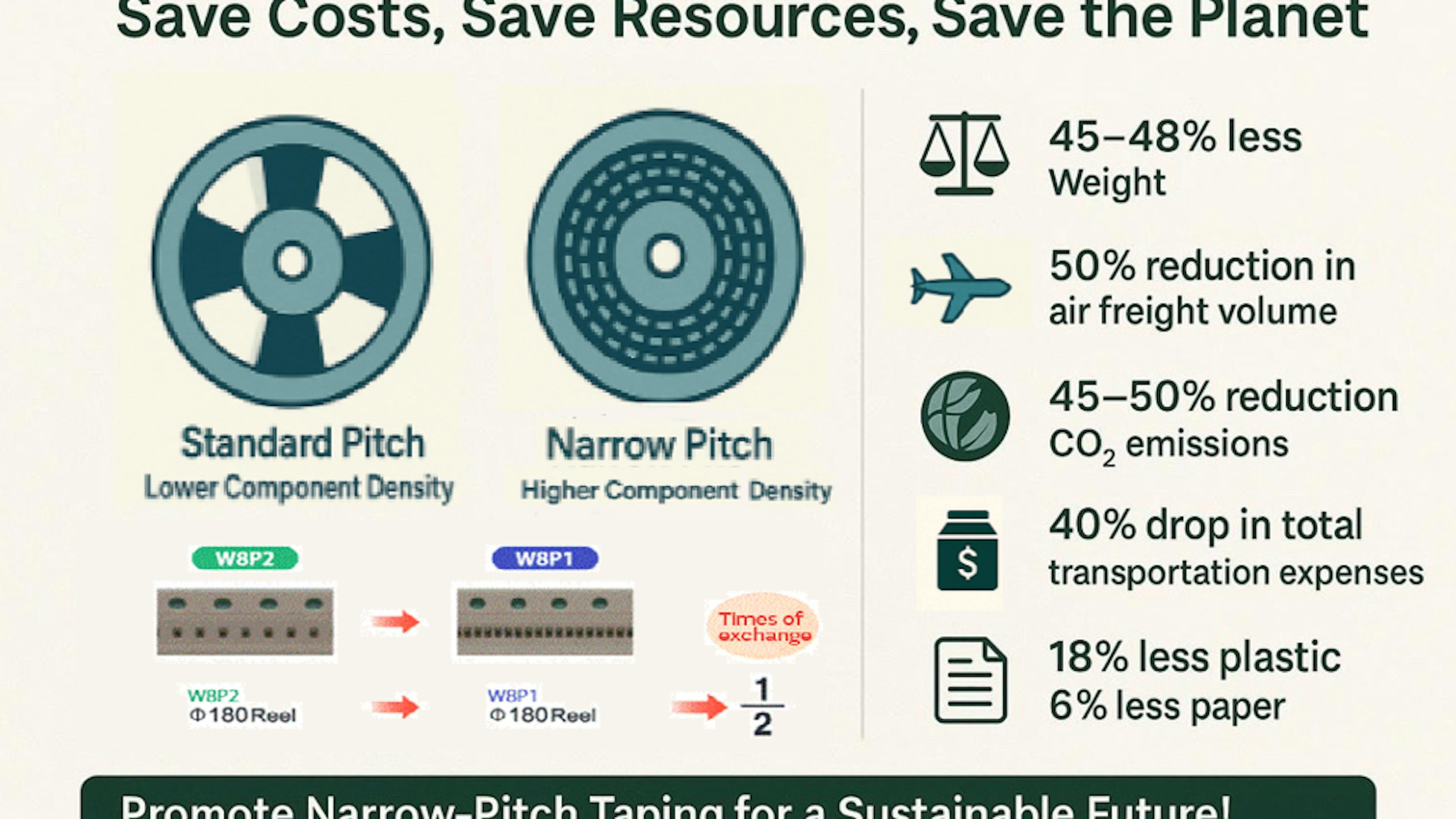 Murata has optimized the way they package chip capacitors by reducing the space between components on reels. This “narrow pitch taping” allows nearly double the number of components to be packed in the same space, significantly reducing packaging material and plastic use.