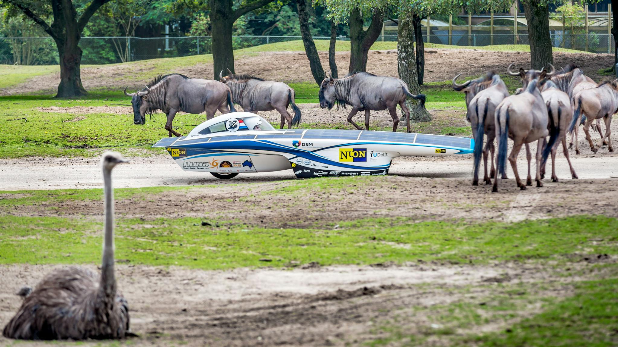 Om te oefenen in een omgeving tussen het Afrikaanse wild deed het team een testrit in safaripark Beekse Bergen. Net als in Afrika: de giraffen en leeuwen lopen zomaar de weg op.
